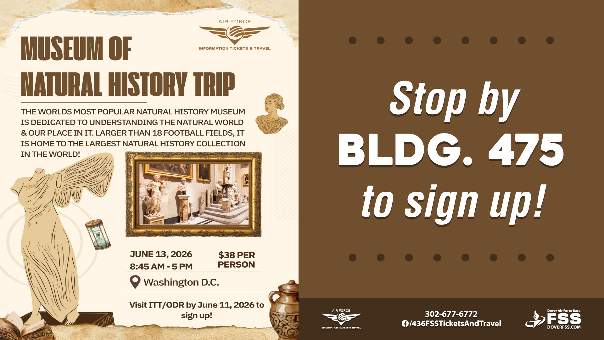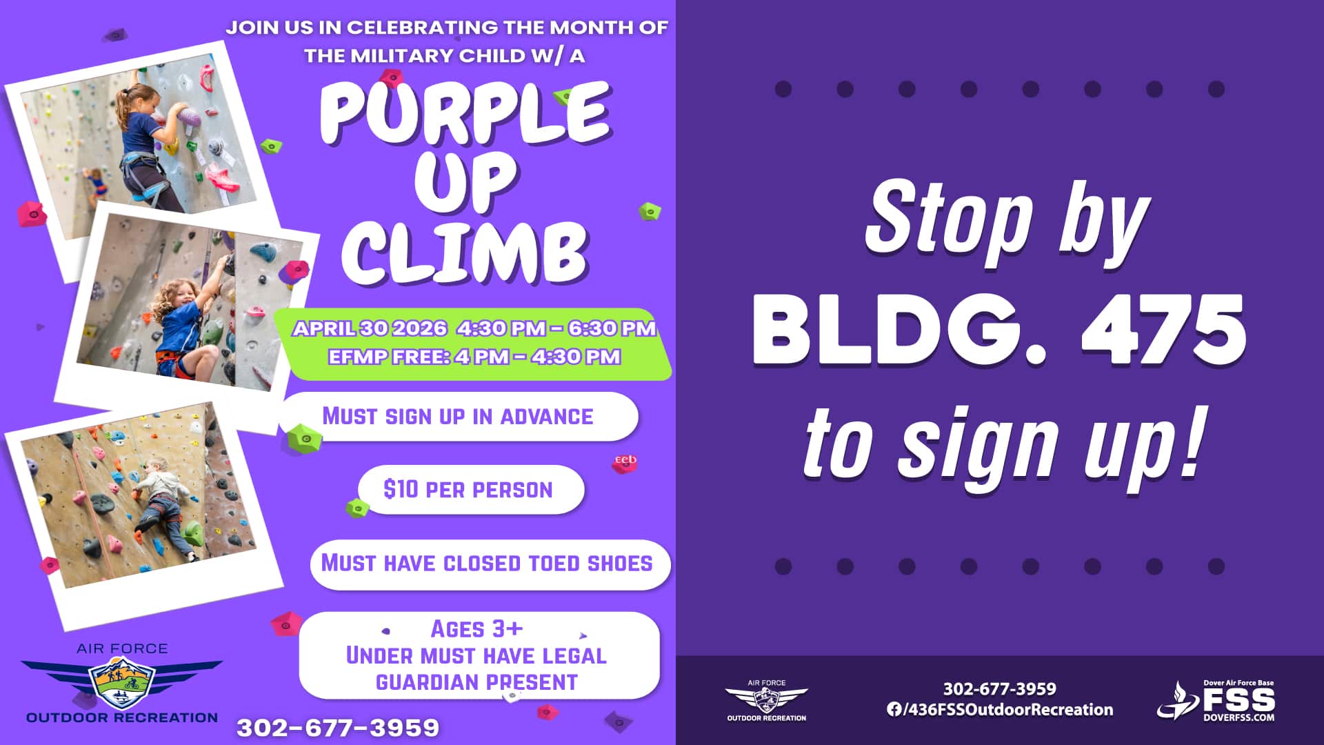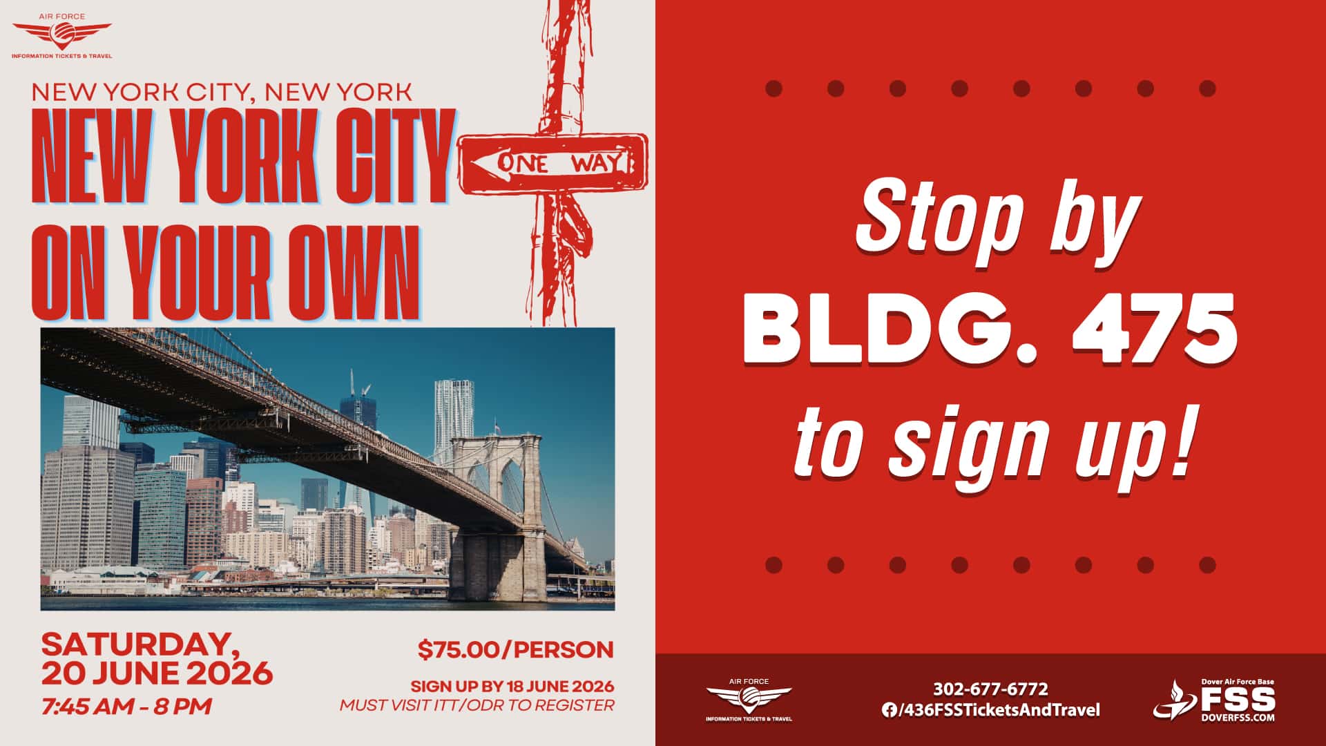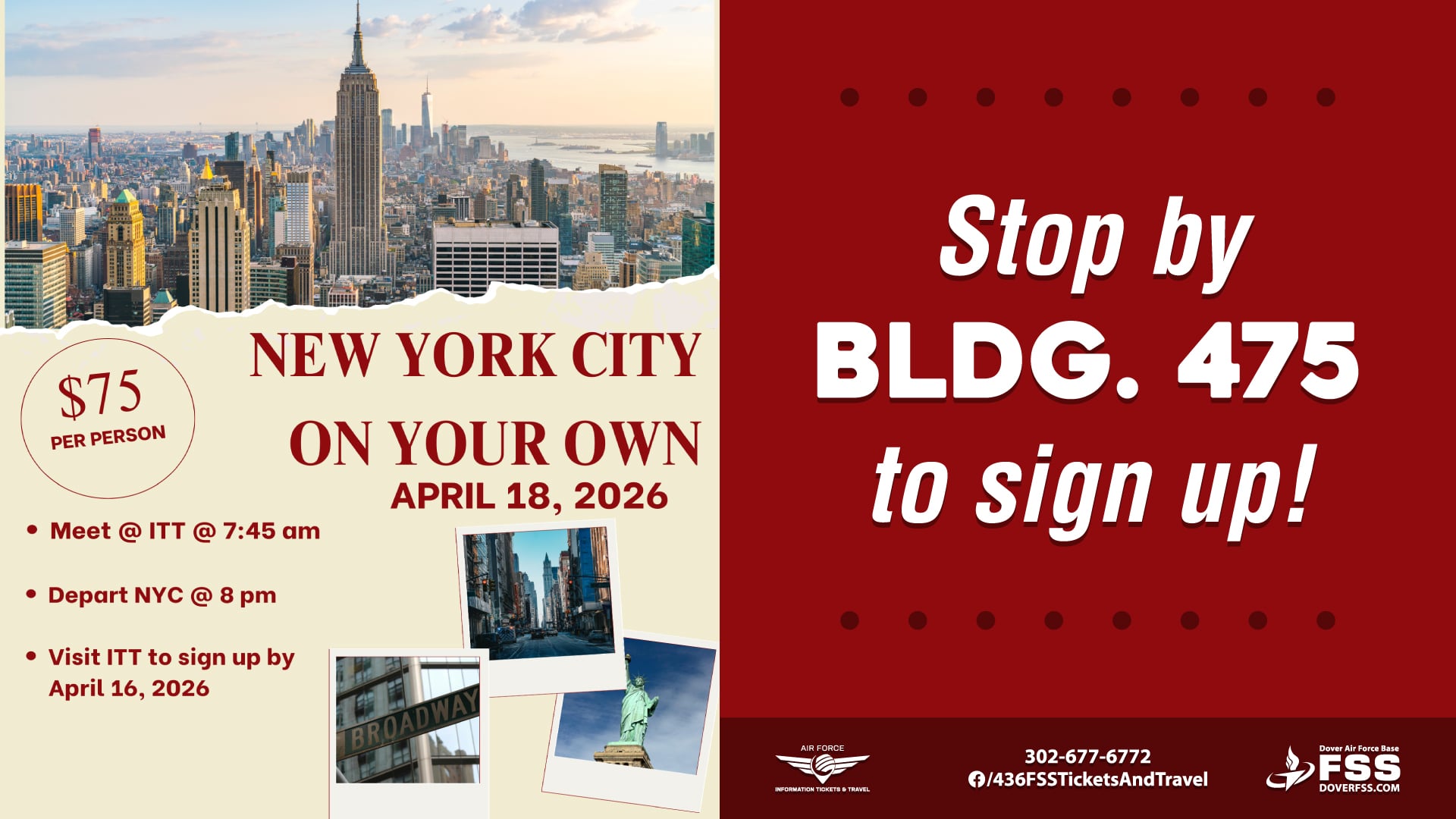 Check out just a few of our upcoming events at Dover Air Force Base! From rock climbs to New York trips, we’ve got something for everyone! Click below to view our full calendar.