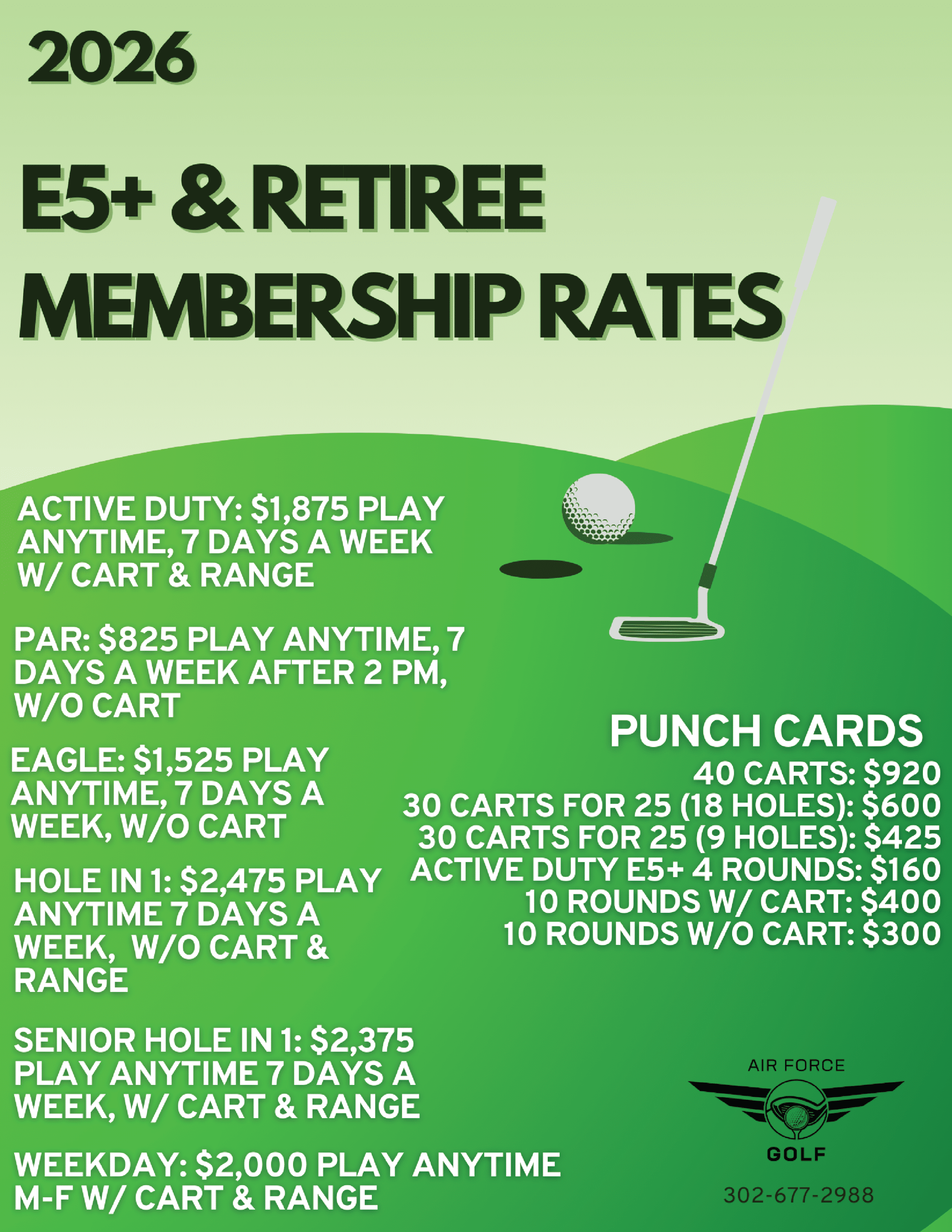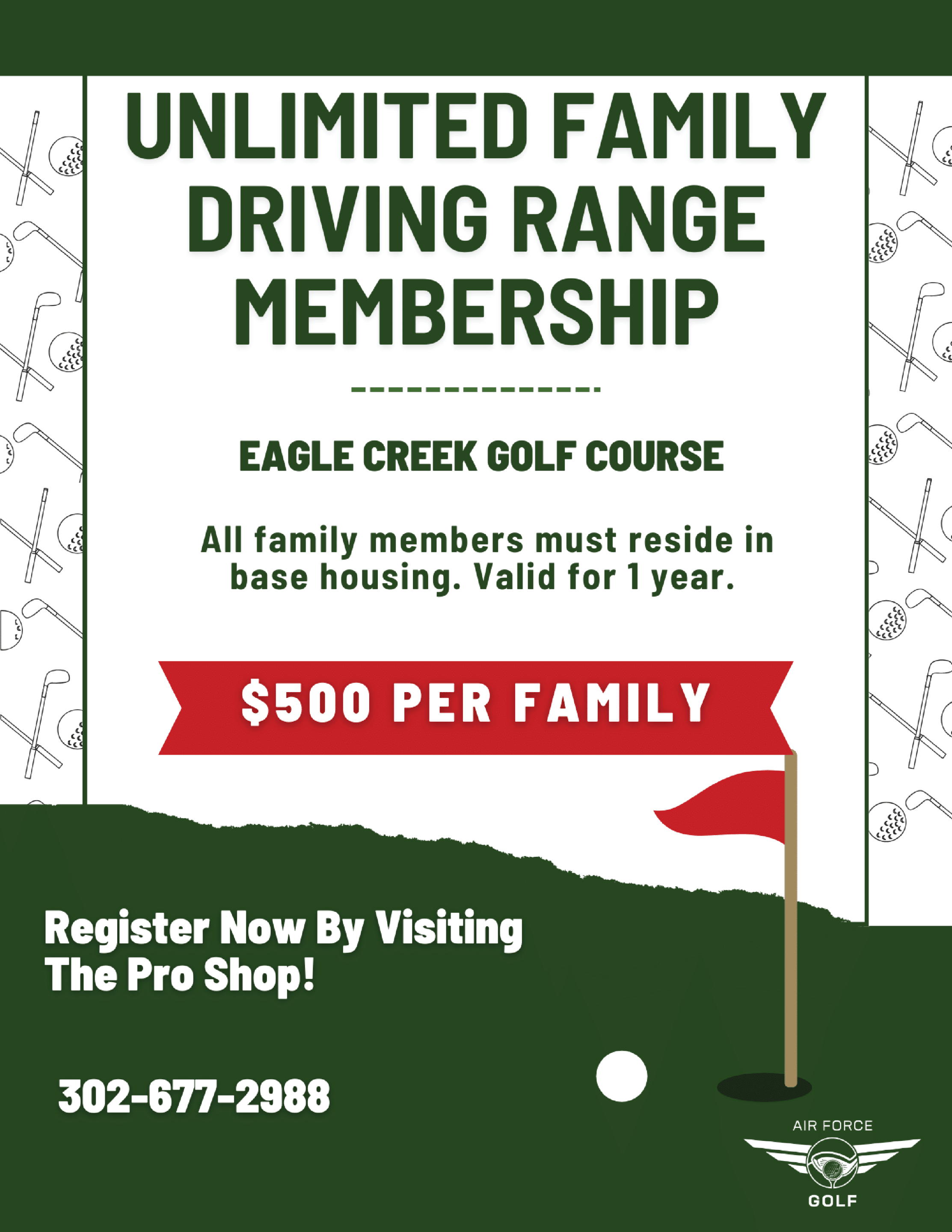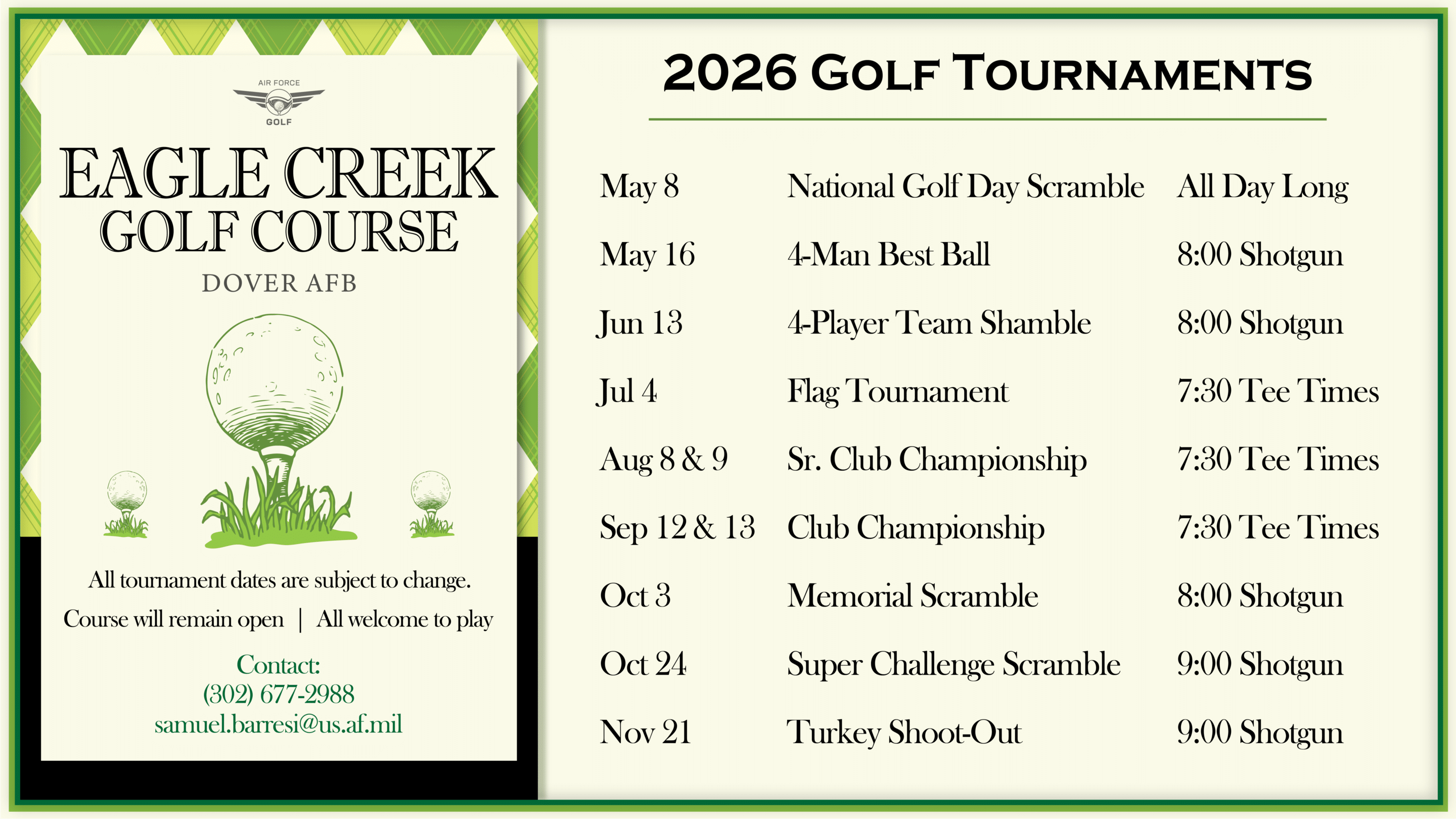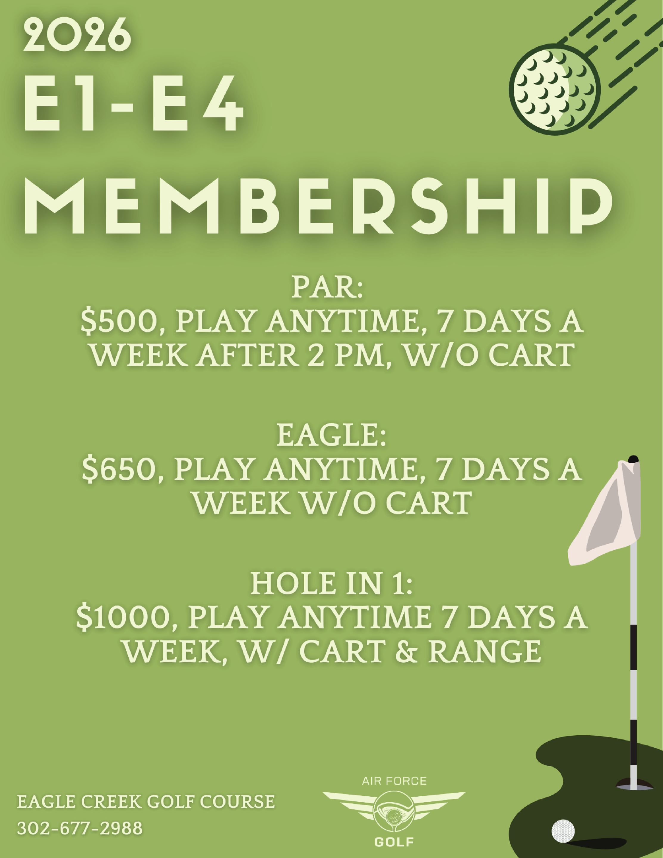 If you would like a 6-month Civilian Access golf pass to play at Eagle Creek, please call us at 302.677.2988!